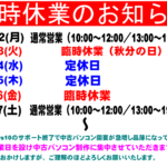 - 9月23(火)~26(金)臨時休業のお知らせ平素はPCワールドをご利用いただき、誠にありがとうございます。 誠に勝手ながら、2025年9月23(火)・26(金)は臨時休業とし中古パソコンの制作に集中させていただきます。休業日ならびに定休日は、お問い合わせやご注文の […]