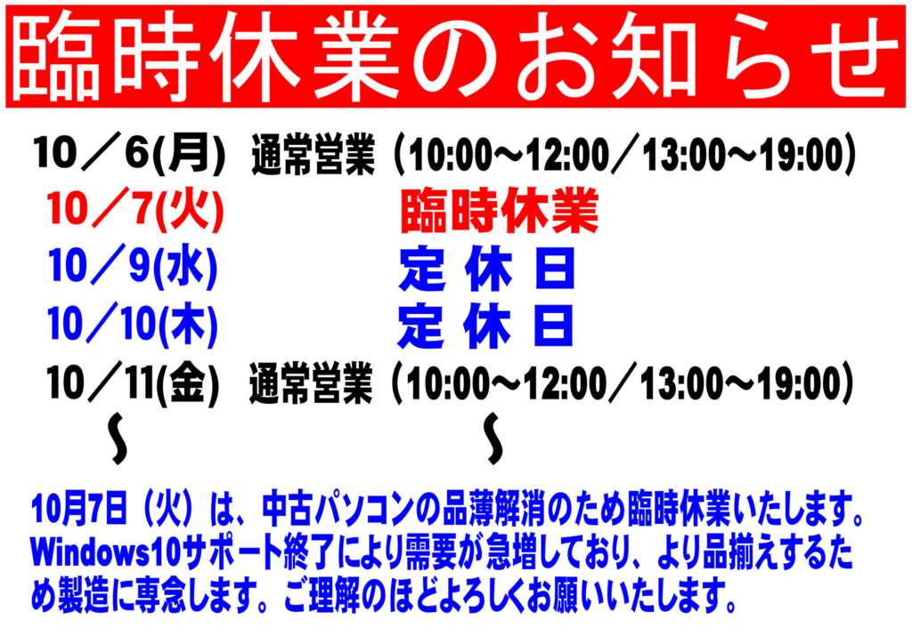 誠に勝手ながら、2025年10月7日(火)は中古パソコンの制作に集中するため店舗業務を休業とさせていただきます。