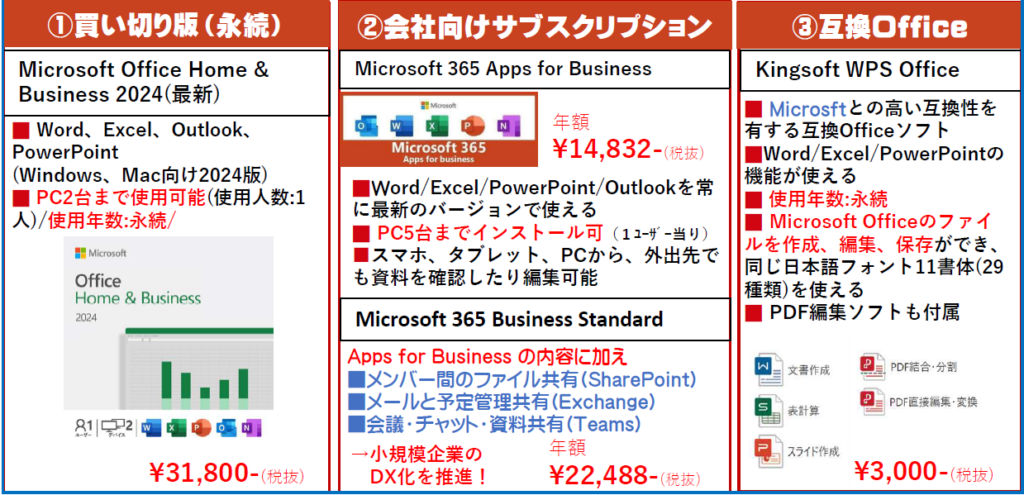 Word・Excel・PowerPoint が必要な方には、3通りの購入方法でお応えします